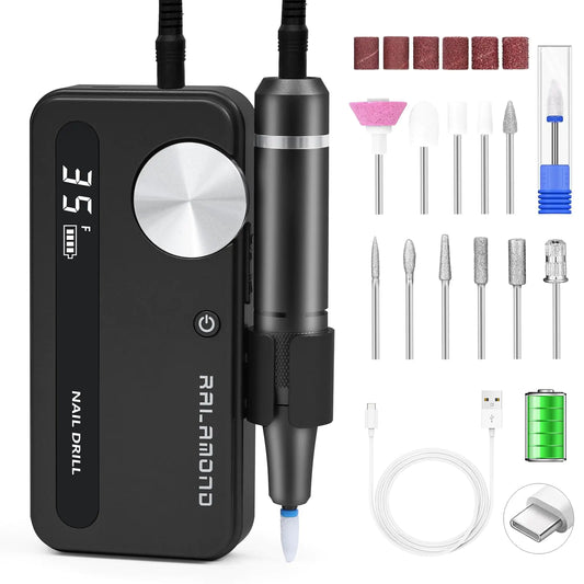 RALAMOND 35000RPM Nail Filer Electric Nail Drill Professional Cordless Nail Drill Machine Portable Rechargeable Nail Drill Drill Nails Tool for Manicure Pedicure Salon & Home (Black)